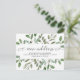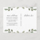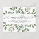 Det här trendigets botaniska ändring av vykortet adress har en ram av rikligt vattenfärgsfärgat grönt löv och några små bär på en ren vit bakgrund. Ord "ny adress" visas i elegant, snabbt i kalligrafi. Ett enkelt men snyggt flytta-meddelande som du kommer att vara stolt över att skicka till vänner och familj.
