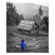 Vackert Serene Minimalist Black and White Photography Landskap i en gammal by med blå Seltive Färg av en kvinna där hennes rygg vände till Camera PHOTO PRINT ART. #ruralhouse #landcapephotography #minimalistfotografi #svart andwhitephotography #monokromefotography #selectivecolor