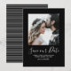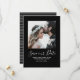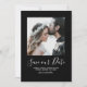 Minimalistiskt Photo Spara datum meddelande med en färsk och enkel fyrkantig fotoskärningsdesign i svart. Lägg till ett foto och dina bröllop-detaljer som du vill anpassa. Tunn vit rand på baksidan av inbjudan. Bakgrunden färg på baksidan av inbjudan kan ändras för att komplettera bilden eller för att lägga till färg i bröllop.