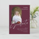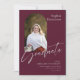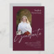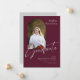 Den här platta studenten-annonsen på 5 x 7 tum har ett bågformsfoto på framsidan på en burgundisk bakgrund med lätt grått-bokstäver. Bland platshållarna finns student, namn, högskola eller universiteten namn grad, fokusområde och ytterligare information, t.ex. speciella hedersbetygelser.