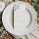 Elegant vår vattenfärgslavender bröllop-menyer. Anpassa med datum och meny för namn och bröllop.