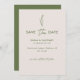 Ett minsta och elegant oliv grönt kort och grått bröllop spara datum-kort med enkel text och skriptbokstäver samt botaniskt inslag.