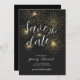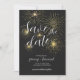 Den här minimalisten sparar datuminbjudan med elegant mousserande fyrverkerier med vitt kalligrafteckensnitt, perfekt för ett modernt bröllop spara datum. Den minimalistiska utformningen av bröllop spara datum inbjudan har romantiska fyrverkerier i guld på en klassisk svart bakgrund avslutat med elegantens kalligrafi.