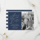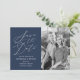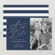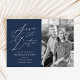 Eleganten sparar datumkorten "Spara datum" som visas i ett vitt kalligrafiskt skript med marin bakgrund. Anpassa flottan med lodräts förlovning, bild, namn, datum och plats för bröllop. Baksidan av det moderna underhållet har datumkortet marin och vit rand.