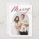 Modern julfotokort med "Merry" som visas i ett fet rött skript överst på designen med vit bakgrund. Lodräts foto visas i en båge ram. Anpassa framsidan av fotojulkortet med din familj namn och år. Baksidan av det enkla helgdag har ett extra foto med utrymme för ditt personliga meddelande.
