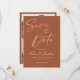 Den här snyggten och trendiget Minimalist Modern Simple Boho Photo Save the Date Card blandar sömlöst enkelhet med boho charm, vilket skapar perfektens introduktion till det kommande firandet. Med terracotta färg palett och calligraphy script typography, exuderar bröllop spara datum en contemporary vibe som utmärker sig. Den enkla designen gör det möjligt för det valda fotot att gå i mitten och ge meddelandet en personlig beröring. den upphetsning du kommer att få med ett spardatum som perfekt förmedlar klass och elegans, samtidigt som du håller den enkel och smidig snyggt. Gör din planeringsresa i bröllop enkel och stressa gratis genom att köpa ytterligare artiklar från vår förstklassiga, moderna, minimalistiska Elegant Terracotta Wedding-inbjudningar.