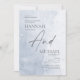 Dessa formella bröllopsinbjudningar i storleken 5" x 7" har en minimalistisk design med grå bokstäver på en dammig blå akvarellbakgrund med följande platshållare, hederstitel, föräldrars namn, introduktion, brudparets för- och efternamn, veckodag, datum, tid, lokal, lokalsadress och mottagning. Introduktionen lyder "inbjuder till sin dotters bröllop".