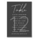 Den här chicen och det moderna bröllop-bordsnummer-platskortet har en grått-bakgrund i mörken med skript i vitt. Anpassa den efter dina behov. Du hittar matchande produkter i min butik.