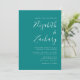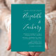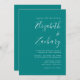 Den här enkla moderna bröllopsinbjudan innehåller vit text på en tealblå bakgrund. Lägg till bildens och bildens namn i snyggtens handskriftsgrafi och detaljerna i sans serif-teckensnitt. Den omvända sidan är en matchande ton av solid teal.