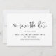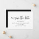 Modern svartvitt och vitt typografi Bröllop Postponement Announcement Card med en enkel design med "spara om datumet" i ett elegant med ett tunt handskriftsteckensnitt. Här följer fyra linjer text som du vill ha mer information om. Baksidan har ditt personliga meddelande i vitt över en svart bakgrund. Chic och snyggt för att meddela att bröllop har skjutits upp.