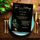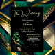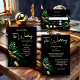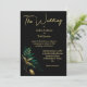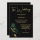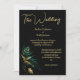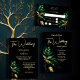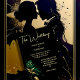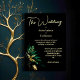 Det här bröllop-kortet har en elegant, minimalistisk utformning med svart bakgrund och guld, som skapar en sofistikerad och formell estetisk teknik. Skriptet och serif typsnitt används i en balanserad sammansättning, ge det till en modern men klassisk känsla. Det lämnat hörnet i grund är försett med botaniska illustrationer i grönt och guld, vilket gör att den övergripande utformningen blir lite mer naturlig och lyx. Utformningen är ren och organiserad, så att de viktiga detaljerna i bröllop tydligt framgår. Anpassa kortet med namn och information om bröllop. Du kan ladda ned kortet till din mobila enhet eller dator. Kortet skapades med hjälp av ai.