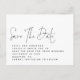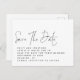 Minimalistiskt svart vitt skript sparar datumet. Ett bekvämt vykort som gör det möjligt för gästerna att få veta ditt bröllop-datum med denna minimalistiska svarta och vita design med informella skript för huvudet och mycket tomt utrymme för en contemporary.