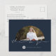Dessa enkla 5,6" x 4,25" examens-tack-kort har ett valvformad foto på framsidan mot en marinblå bakgrund med "tack" i stora ljusgråa signaturbokstäver och platshållare för examenstagares namn och examensår. Baksidan har platshållare för avsändarens namn och returadress, tillsammans med valfri mottagaradress och tackmeddelande.