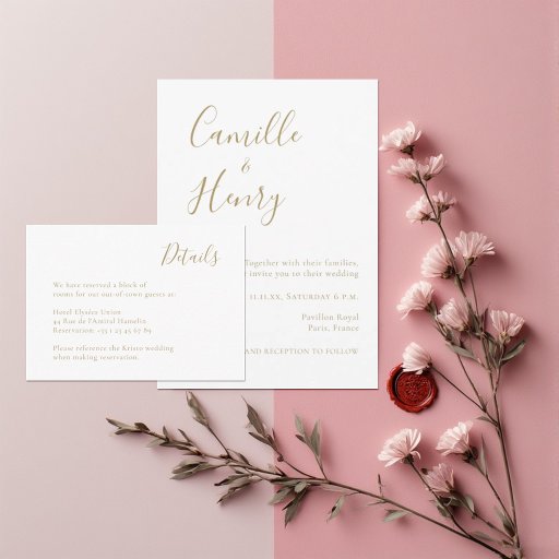 Denna inbjudan fokuserar på djärv, vacker guldsatsning och en minimalistisk layout. Genom att centrera på parets namn i ett chic, modernt teckensnitt är denna svit perfekt för paret som tror att mindre verkligen är mer. Ett tidlöst val för ett modernt stadshustru eller en elegant herrgårdscelebration. Den vita och gyllene paletten ger en fräsch, ren estetik som aldrig går ur stil.