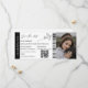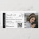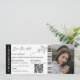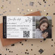 Modern minimalistisk påstigning i monogram passerar bröllop biljett med en enkel vit och brun bakgrund, ett foto av det förlovade paret, ett flygplan med en slingspil och en enkel justerbar besparingsmall. Glöm inte att uppdatera texten på baksidan av monogrammet.