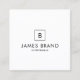 En minsta kvadratisk design med ditt monogram, med ditt namn och titel på affärskortets framsida. På baksidan finns kontaktinformation med hjälp av en textplacering på högerna. Den här minimala mallen för kvadratiska affärskort är dubbla sidosatt, perfekt för enskilda professioneller eller företag. Teckensnitt färg, text och storlek kan vara personlig. Minimal design är alltid i trenden och därför tidlös. Att rama monogrammet med ett tunt kvadratiskt gräns skapar en elegant känsla.