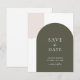 Sätt tonen för din bröllopsfest med detta minimalistiska "save the date"-kort med två valv. Ett enkelt salvia grönt valv och ett enkelt beige rustikt valv i hörnet. Den rena, retro-layouten ger en modern tolkning av elegant bohemisk stil, vilket gör den idealisk för par som planerar en utomhusfirande, gårdsbröllop eller intim sammankomst.
