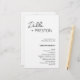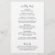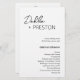 Modern svart och vitt bröllopsprogram med en enkel och minimal design med bridens namn i ett elegant-skript och rummets namn i en contemporary sans serif-teckensnitt. Nedan i det nedre hörnet av högerna finns din händelseinformation och ceremonin i en minimalistisk layout. Baksidan har din bröllopsfest och tack för ditt budskap.
