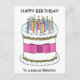 En stor tecknad födelsedagskalas täckt i ljus mot vit bakgrund. Ord ?Grattis på födelsedagen till en speciell minister? följer med bilden.