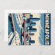 En reseaffisch mellan vintage och stil visar en serenvintern i Minneapolis med skylten och broar som täcker en delvis frusen flod, allt under blå himmel med mjuka vita moln. "MINNEAPOLIS" visas djärvt överst.