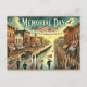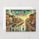 Här är ett vintage-reseaffisch i akvarellstil för Minnesdagen (USA), med en patriotisk parad i en liten amerikansk stad med tegelbyggnader dekorerade med flaggor och vimplar, veteraner som marscherar stolt och barn som viftar med flaggor. 🇺🇸✨ Designen har mjuka, urblekta färger och nostalgisk vintage-typografi, vilket ger en hjärtlig och charmig look.