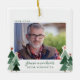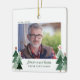 Minnesmärke för alltid i våra hjärtan Modern men rustik jul Julbild fyrkantiga ornament med små skogar av rustika julgranar och God Jul i modern typsnitt. Lägg till 2 av dina favoritbilder för det perfekta minnessmycket! Vänligen kontakta oss på cedarandstring@gmail.com om du behöver hjälp med designen eller matchande produkter.