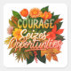 Ett sjudande kvadratiskt klistermärke med ett överflöd av färgstarka blommor i fullt, som symboliserar mod och möjligheter. Blommorna arrangeras i ett dynamiskt, uppåtgående mönster, vilket tyder på modets djärva och proaktiva karaktär. Det ljusa, glada färg väcker en känsla av optimism och positiv inställning, vilket stärker budskapet att tillvarata livets möjligheter med tillförsikt och beslutsamhet.