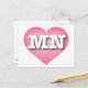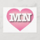 Det här vykortet har en lugn, coola och ett insamlat rosa hjärta med ett vitt tvättat centrum som innehåller det feta, vita, övre fodral brev MN, officiell-förkortningen för Minnesota, den norra stjärnstaten. Baksidan av vykortet är tom och väntar på dina handskrivna känslor eller anpassade texter.