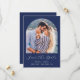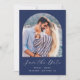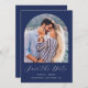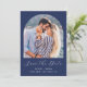 Den här enkla, minimalistiska Spara datumkortet har en boho-fotobåge ovanför orden "Spara datum" i ett vitt handskriftsskript i elegant, följt av parets namn, bröllop datum och stad i sans serif-teckensnitt på en marin blå bakgrund. Lägg till ett mer detaljerat meddelande med ytterligare information om det omvända.