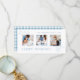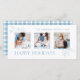 Ren minsta botaniska utformning av helgdag med Glad helg-skript hälsning med linjeritade dammiga blå löv, trefotomall och redigerbar text fält med kompletterande blå tartan mönster på baksidan.