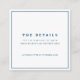 Modern mycket enkel grafisk marinblått och vit kvadrerar bröllophändelse specificerar kortet. Perfekt för ett enkelt minsta eller modernt bröllop i informerade behållagäster. Redigera detta kort med dina egna namn som gifta sig datera, och händelseschema och annat specificerar. Andra matcha tillgängliga bröllop- och händelseobjekt. Designat vid www.mylittleedenweddings.com