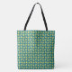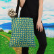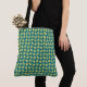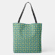 Dam Large Shoulder Bag-konstruktionen i mönster av gult trianglar med blå kvadrater som slumpmässigt läggs ut mot en grönt bas färg.