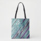 Purple Polka dot with purple and silver diagonal striped retro-modern tote bag on a Mint Green background.