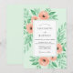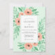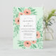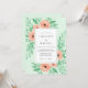 This design features a soft mint green background adorned with delicate watercolor florals in shades of peach and salmon. Lush greenery and leafy accents create a romantic, botanical atmosphere perfect for a seasonal outdoor event. The artistic style highlights the gentle textures of blooming roses.