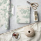 A delicate and timeless mint green toile pattern wrapping paper featuring elegant birds, ornate floral arrangements, and vintage-inspired decorative frames. Each element is beautifully illustrated in fine linework, creating a classic French country aesthetic. The repeating motifs include lush blossoms, vases, and perched songbirds, all set against a soft cream background that enhances its refined and graceful feel.