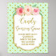 Kandy guating-jaktskylten poster för babydusch i mynta grönt och guld-punkter mönster med guld gräns, rustisk rosa och persikofärgade vattenblommor och handskrivna brev från stil.