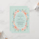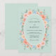Denna design har en lugn mintgrön bakgrund prydd med ett frodigt arrangemang av vattenfärgade persikorosor och ömtåliga ljusblå blommor. Kvistar av silverfärgad eukalyptus och grönt bladverk skapar en mjuk, romantisk atmosfär perfekt för en säsongsbetonad tillställning. Paletten balanserar varma koralltoner med svala sjögröna och himmelblå för en tidlös estetik.