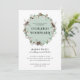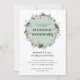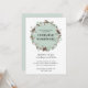 En unik inbjudan till baby shower med tema 'mamma att bli' med inslag av bin och en botanisk eukalyptus- och bomullskrans. Mintgrön på vit bakgrund.