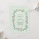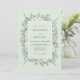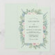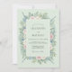Denna design har en mjuk mintgrön bakgrund som kompletteras av en frodig akvarell blomkant. Ömtåliga rosa rosor och ljusblå blommor är parade med silverdollareukalyptus och salvia bladverk. Den övergripande estetiken är romantisk och luftig, vilket gör den till ett perfekt val för ett säsongsbundet vår-event.