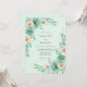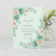 En mjuk mintgrön bakgrund sätter scenen för denna eteriska design med akvarellbotaniska element. Frodig tealgrönska och ömtåliga persikoblommor skapar en frisk, luftig estetik. Den måleriska stilen och den lugna färgpaletten frammanar en romantisk atmosfär, perfekt för en säsongsbetonad vårceremoni.