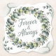 En delikat bröllopshälsningskort med en vacker, detaljerad akvarell-eukalyptuskrans i nyanser av mintgrönt och salvia, som omger en subtil, texturerad vit bakgrund. Kransen är prydd med spridda små kvistar av baby's breath och små pärl-liknande accenter, vilket skapar en elegant och något rustik känsla, med ett mjukt sken som förstärker akvarelleffekten. Tvärs över mitten av kransen visas texten “FOREVER & ALWAYS” i ett flödande, modernt script-teckensnitt i en mjuk silvergrå färg, som kompletterar de naturliga tonerna och frammanar en känsla av tidlös romantik. Kortets insida ger gott om utrymme för ett hjärtligt meddelande och har en förenklad eukalyptus-kvist-illust