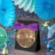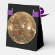 Svarta tält stil med lila menyfliksområde med en bild av en bländande speglad disco boll. Byt menyfliksområdet till guld om du vill se mer elegant. Se matchningsinbjudan, konetti, favoritpåse, favorittagg, etikett, rund klistermärke och papper förpackning. Visa hela Disco 70s Favorbox-samlingen i SPECIELLA TUUCHES | Avsnittet Party favors.