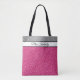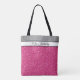 Den här tote-påsen visas med en roligt faux Shock rosa glitter tryckt. Har ett faux Silver glitter-band överst med personligens titel, namn eller favoritfras.
