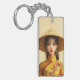En ung flicka som bär traditionella vietnamesiska kläder, som verkar vara en áo dài. Hon är klädd i en sjudande gult áo dài, med en slående foenix mönster. Flickan har ett känsligt ansikte, med rött läppar, stort mousserande ögon och långt svart hår som flyter försiktigt ner.