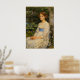 “Miss Betty Pollock” by John William Waterhouse presents a quiet, intimate portrait set outdoors beside a lily pond. The young sitter, framed by a pale tree trunk and a soft veil of greenery, turns toward the viewer with a calm, direct gaze. Her copper hair is gathered with small flowers, echoing the blossoms and leaves at her side, while her white dress and blue sash catch the light and stand out against the shaded water and mossy banks.