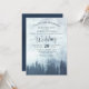 Den här vackra bröllopsinbjudan har en rustik ännu elegant stil med lacy script calligraphy på en vattenfärgsbakgrund med blå bergskarpsill eller gräs träd som är höljd i dimma eller dimma. Färg är en mängd blå nyanser, skapar den här inbjudande perfekten för en utlandsceremoni, vildmark eller vinterceremoni. På baksidan finns utrymme för en QR-kod och webben adress där gästerna kan få mer information och OSA.