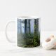 Moody forest photography at daybreak: tall evergreen trunks rise through soft morning mist while pale sunlight filters between trees. Deep greens, mossy ground, and dewy ferns sit under a dreamy fog layer in cool blue-gray tones, creating a calm, cinematic atmosphere. Natural light rays and gentle shadows add depth, serenity, and quiet woodland magic.