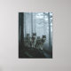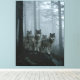 Four majestic gray wolves stand alert on a rocky, moss-covered ledge deep in a fog-shrouded evergreen forest, their piercing eyes cutting through the thick mist. Tall tree trunks fade into the ethereal haze, creating a dramatic and untamed wilderness scene full of quiet power and mystery. This atmospheric wildlife photograph captures the raw beauty of the wild, perfect for canvas prints, posters, throw pillows, phone cases, mugs, blankets, and décor that brings primal forest energy into any space.