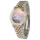 This piece captures a striking moment of calm as a lone horse stands on a cliff overlooking the ocean. Soft mist drifts through the scene, blending with vibrant pink, purple, and orange tones from the setting sun. The mix of dramatic light, gentle haze, and open water creates a dreamy, atmospheric landscape that feels both peaceful and powerful.