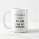 Pappa kommer helt enkelt att älska detta speciella citat och minnesmuggen som visar hur mycket hans barn älskar honom! En bra present till alla speciella pappor. Texten i två olika teckensnitt är "Denna mugg bevisar att mina barn älskar mig!" med dubbel understrykning.